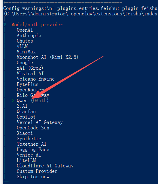 - 在渠道列表中选择Feishu/Lark (飞书)(plugin install);