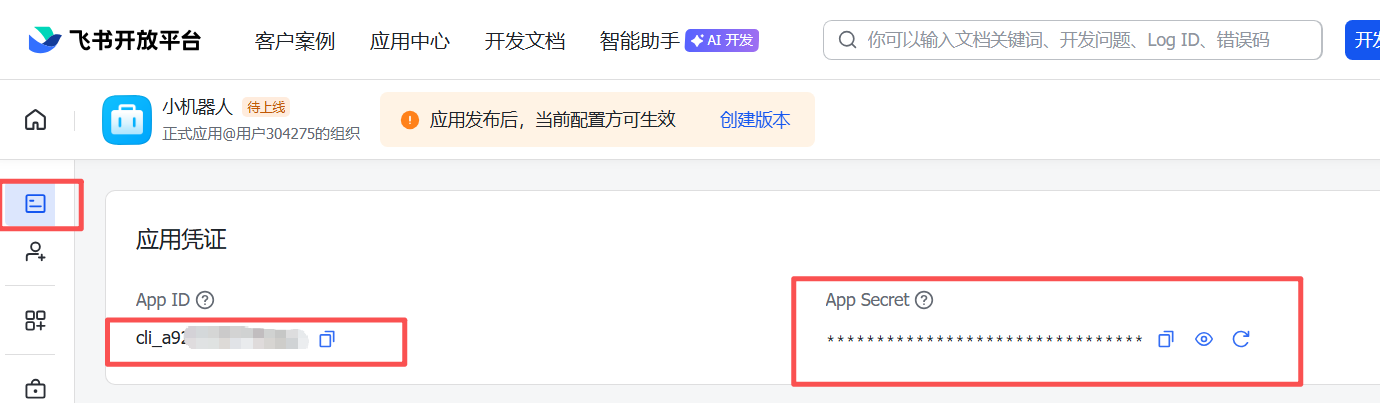 创建完成后,进入应用详情页,在凭证与基础信息中查看并记录App ID和App Secret,后续配置 OpenClaw 需使用。