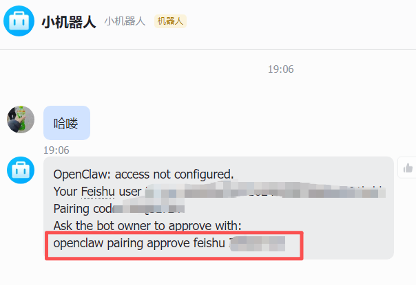 打开飞书,向创建的 OpenClaw 机器人发送任意消息(如 “哈喽”),终端会弹出提示,包含飞书用户 ID和配对码;