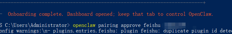 1 | openclaw pairing approve feishu [你的配对码] |