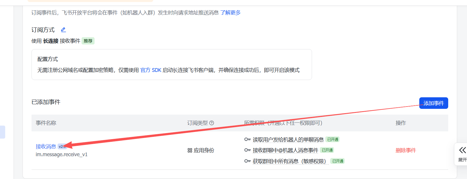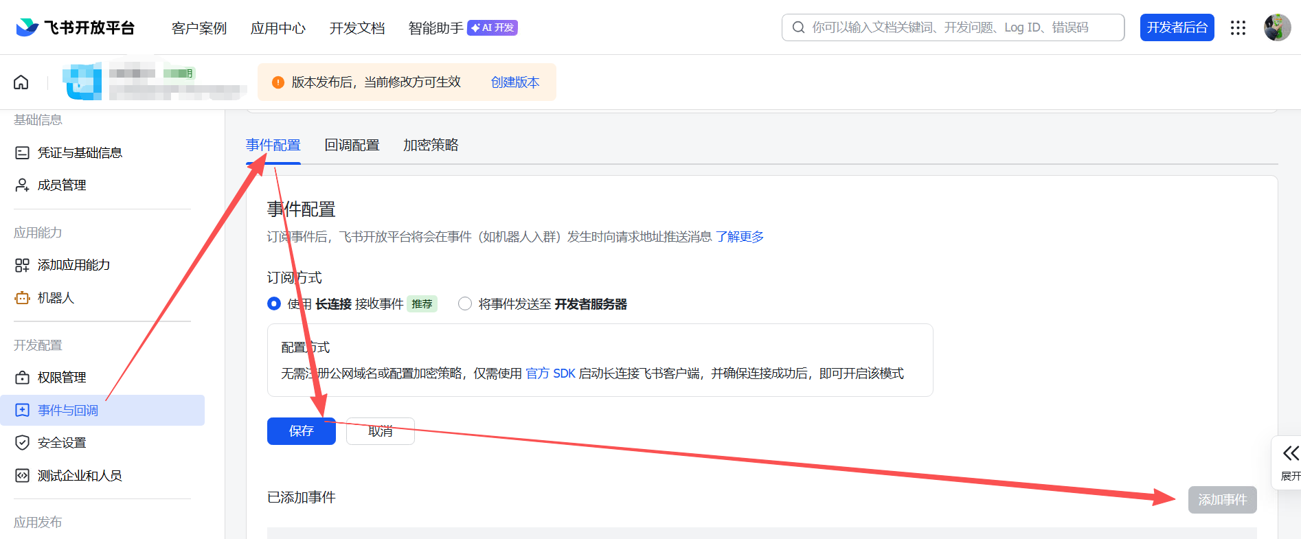 - 在应用详情页点击事件与回调→事件配置→添加事件;